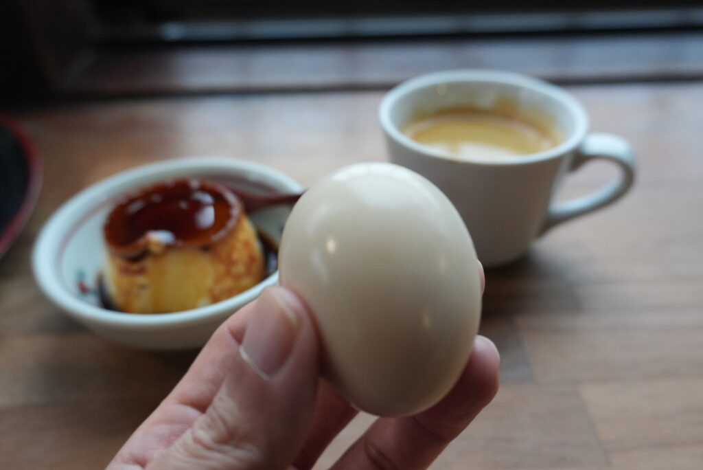 ここでは、名物の地獄蒸しプリン、温泉たまご、そしてホットコーヒーをいただきました。