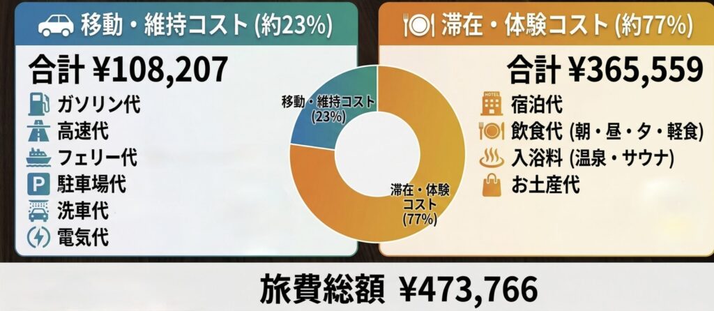 今回の0泊目含む12日間の旅程でかかった総経費473,766円を詳細に分析すると、旅の予算配分の実態が見えてきます。