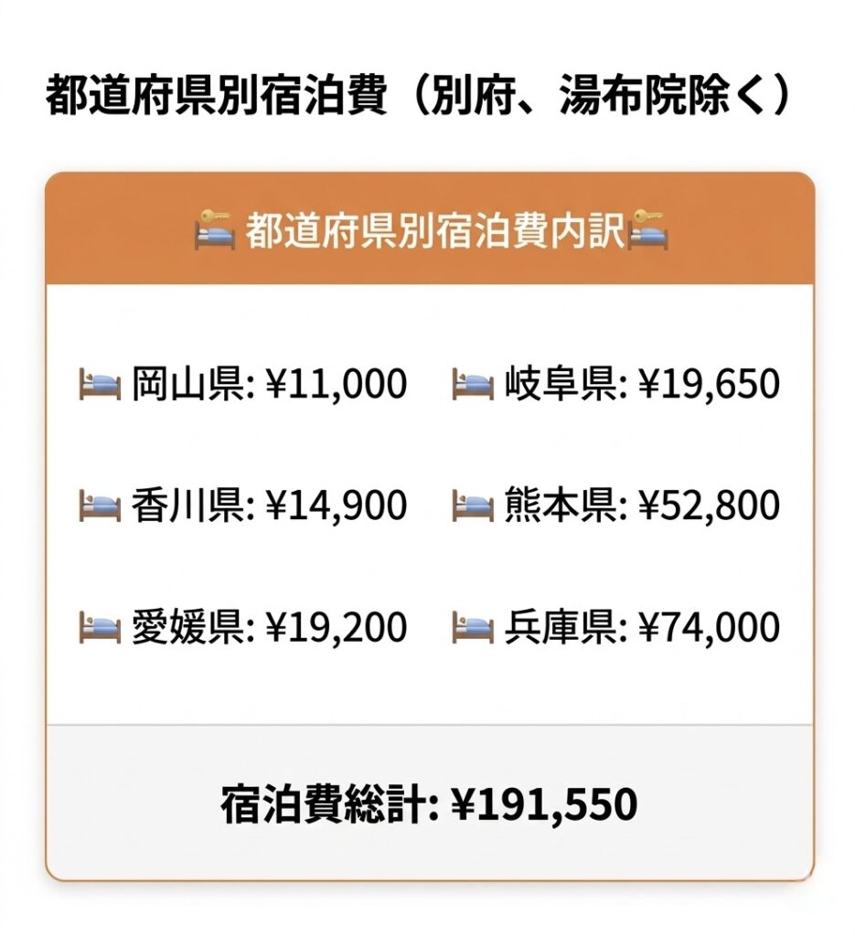 例えば、愛媛県の宿泊代は19,200円ですが、熊本県では52,800円、兵庫県では74,000円となっています。