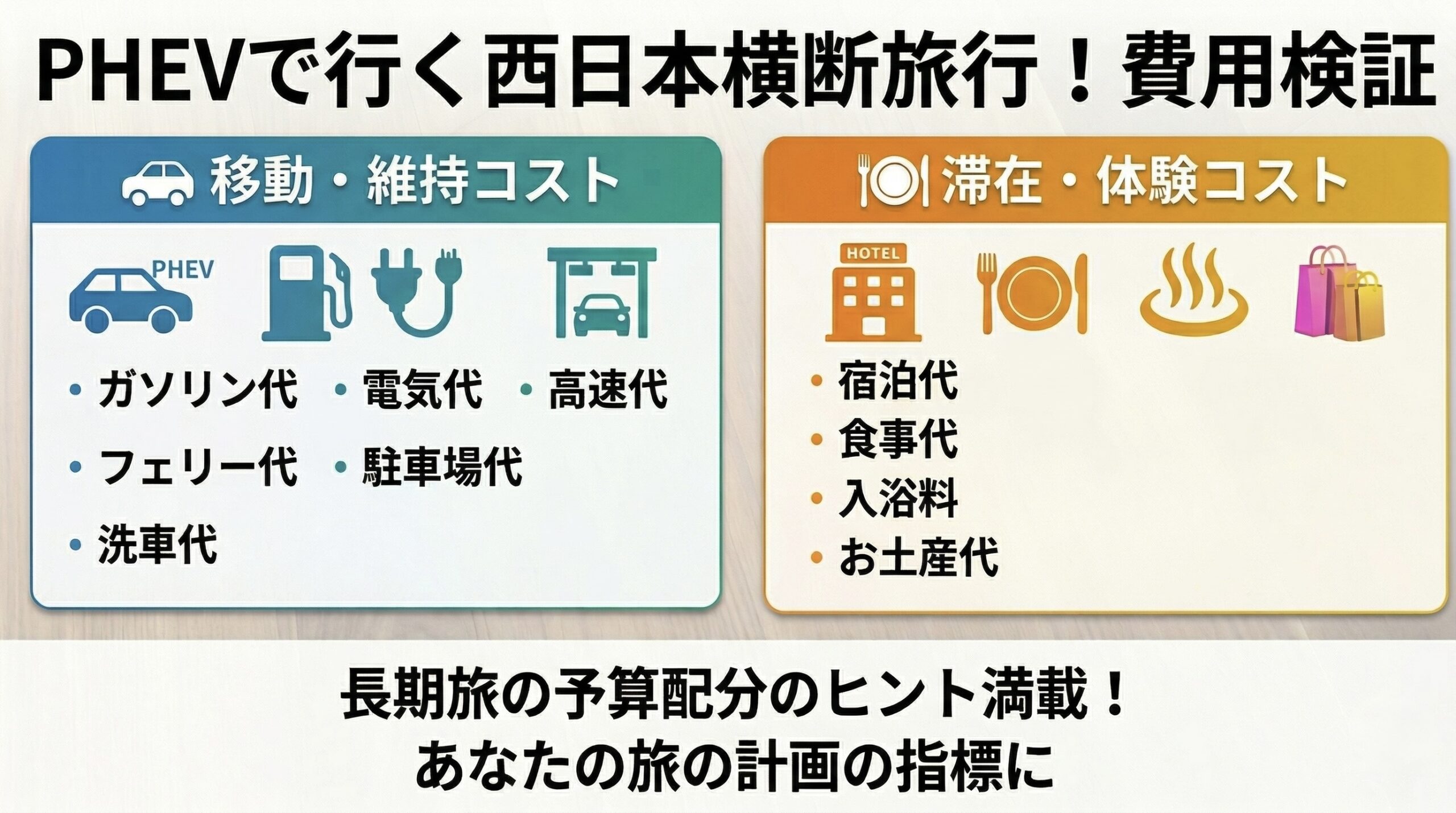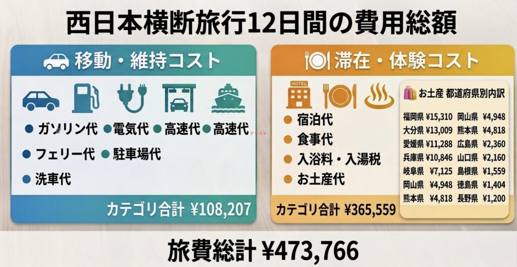 ✅ 今回の西日本縦断ドライブを通して得られた、長距離旅行の予算立てとPHEV車の活用ポイント。