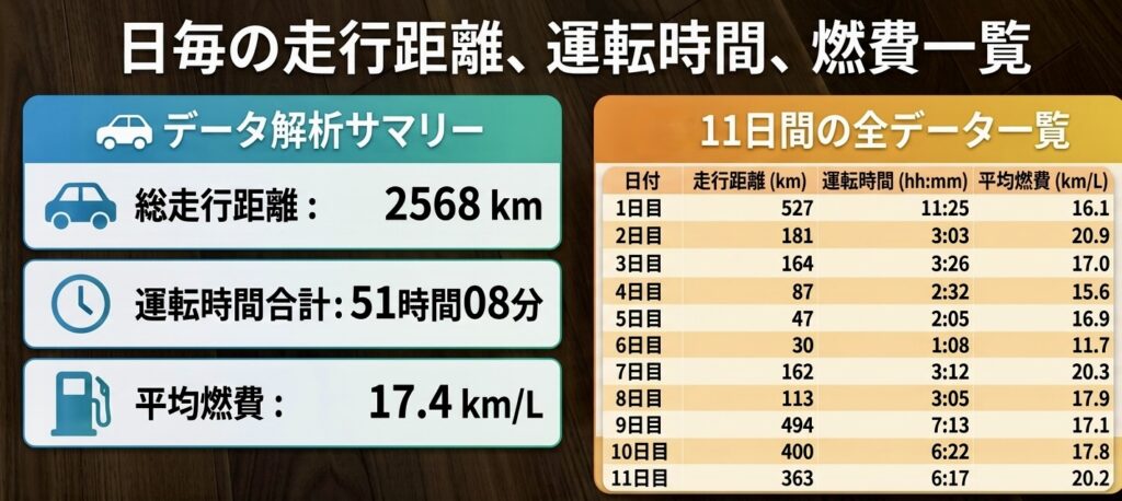 高速道路主体の長距離移動であったことを考慮しても、2トンを超える大型SUVとしては非常に優秀な数値です。